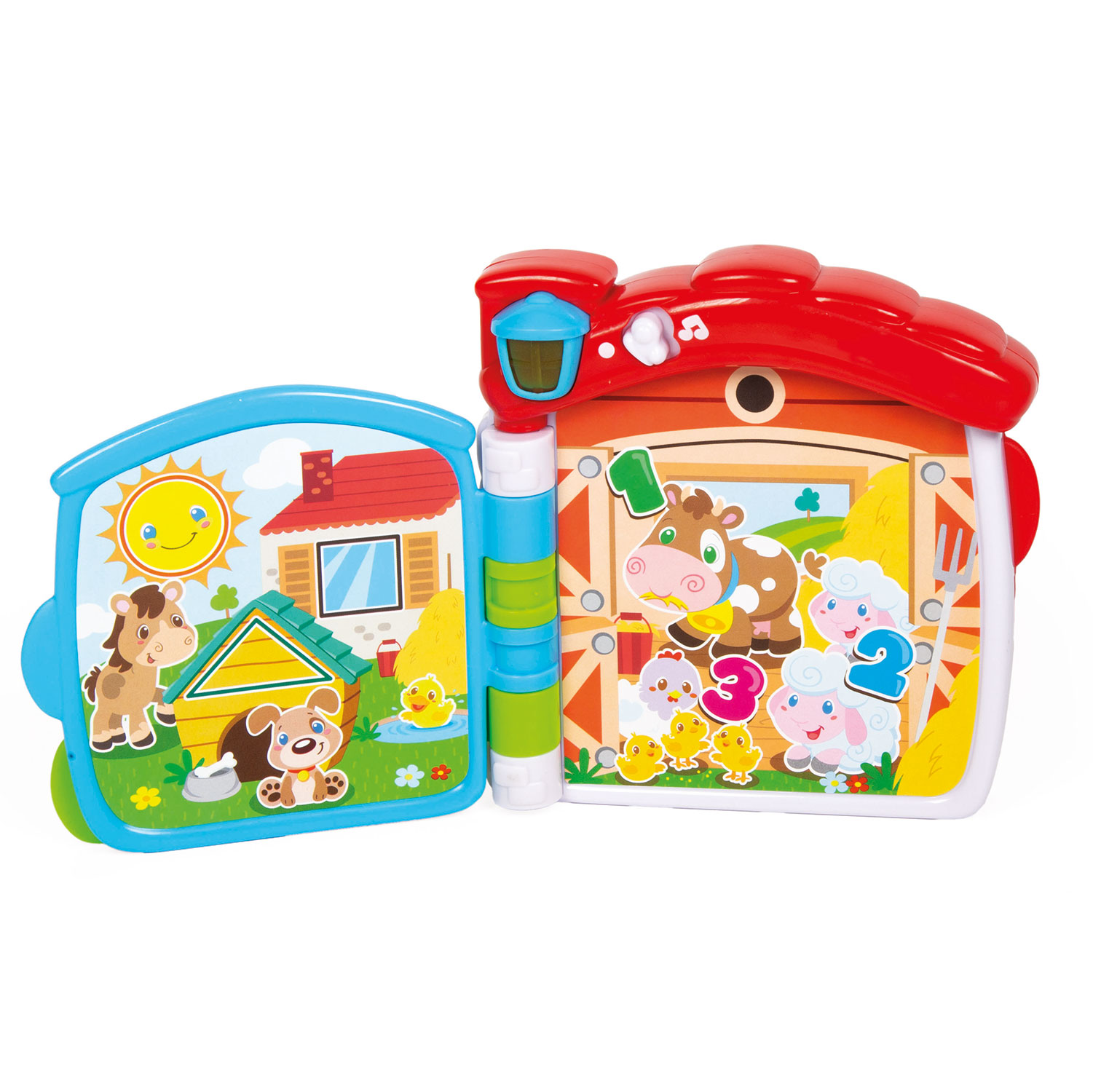 Ένα ηλεκτρονικό εκπαιδευτικό βιβλίο που μιλάει για μάθηση με συντροφιά από ζώα της φάρμας! Γυρνώντας τις σελίδες και πατώντας το κουμπί με το φως στην οροφή του φάρμας, το παιδί μπορεί να γνωρίσει τα ζώα και τους ήχους τους, να ανακαλύψει τα πρώτα γράμματα, τους αριθμούς και τα σχήματα. Ένα βιβλίο γεμάτο διασκεδαστικούς ήχους, τραγούδια και πολύχρωμες ζωγραφιές σε θέμα “φάρμα”. Το φως διδάσκει επίσης τα παιδιά, να διακρίνουν τη διαφορά μεταξύ ‘on’ και ‘off’. Τα παιχνίδια της σειράς Baby Clementoni βοηθούν τους γονείς να επικοινωνούν και να αλληλεπιδρούν με το μωρό από τις πρώτες ημέρες της ζωής του. Με καινοτόμο σχεδιασμό και χρώματα, μη τοξικά και ανθεκτικά υλικά, καθώς και με ανάγλυφες επιφάνειες και πολλές δραστηριότητες ευνοούν την ανάπτυξη των οπτικών, απτικών και ακουστικών ικανοτήτων, την κινητική δραστηριότητα και τους πρώτους λογικούς συσχετισμούς.