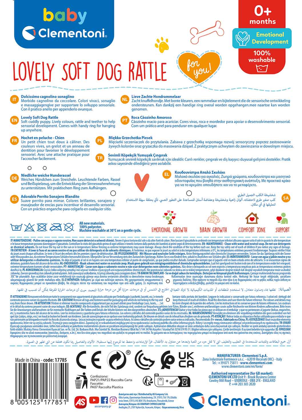 Ένα σούπερ μαλακό παιχνίδι που σύντομα θα γίνει ο καλύτερος φίλος του μικρού σας! Κατασκευασμένο από μια ποικιλία υφασμάτων σε φωτεινές αποχρώσεις, είναι ένας εξαιρετικός τρόπος για να ενθαρρύνετε τα μωρά να εξερευνήσουν τις αισθήσεις τους. Διαθέτει ένα κρεμαστό λαστιχένιο κλειδί για να καταπραΰνει τα ερεθισμένα ούλα του μωρού κατά την οδοντοφυΐα. Πλένεται στο πλυντήριο, ώστε να είναι πάντα καθαρό για το μωρό, όπου κι αν βρίσκεστε. Tα προϊόντα της σειράς Baby Clementoni For You, είναι ειδικά σχεδιασμένα για να συμβάλλουν στη σωστή ανάπτυξη του μωρού σας από τους πρώτους μήνες της ζωής του. Τα χρώματα, οι διαφορετικοί ήχοι, η υφή και η μουσική των παιχνιδιών προκαλούν έντονα το ενδιαφέρον του μωρού. Κεντρίζουν το ενδιαφέρον του και το βοηθούν να ανακαλύπτει τον κόσμο, να νιώθει ασφάλεια και οικειότητα στον χώρο του, αλλά και να ηρεμεί. Τα παιχνίδια της σειράς Baby Clementoni For You, αποτελούν εργαλεία που ενθαρρύνουν την αλληλεπίδραση μεταξύ των γονιών και του παιδιού, και παρέχουν τη γνωστική και συναισθηματική ανάπτυξη του μωρού στη χρήση διαφορετικών υλικών και λειτουργιών. Τα παιχνίδια της σειράς Baby Clementoni βοηθούν τους γονείς να επικοινωνούν και να αλληλεπιδρούν με το μωρό από τις πρώτες ημέρες της ζωής του. Με καινοτόμο σχεδιασμό και χρώματα, μη τοξικά και ανθεκτικά υλικά, καθώς και με ανάγλυφες επιφάνειες και πολλές δραστηριότητες ευνοούν την ανάπτυξη των οπτικών, απτικών και ακουστικών ικανοτήτων, την κινητική δραστηριότητα και τους πρώτους λογικούς συσχετισμούς.