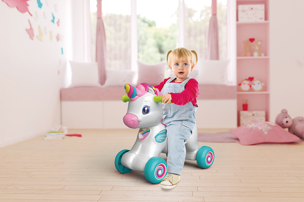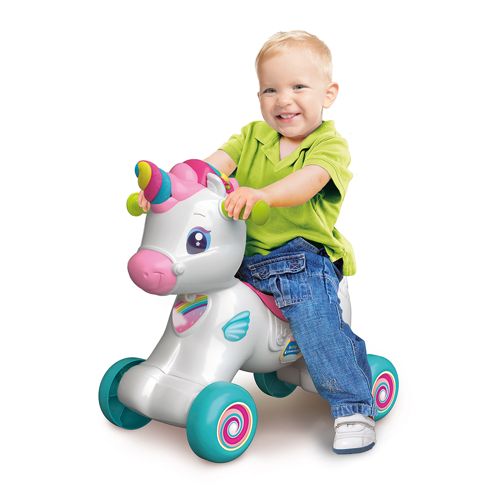 Η Ρίνα είναι η ονειρεμένη φίλη των μικρών κοριτσιών! Ένας χαριτωμένος μονόκερος με πολλές δραστηριότητες παιχνιδιού για ατέλειωτες ώρες διασκέδασης, ο οποίος λειτουργεί και σαν κέντρο δραστηριοτήτων. Μπορεί να χρησιμοποιηθεί σαν κουνιστός μονόκερος ή στράτα. Με εργονομική σέλα και 4 ανθεκτικούς τροχούς για τη μέγιστη αντοχή στο βάρος του παιδιού. Διαθέτει πλήκτρο ΑΒΓ, πλήκτρο ζώων, περιστρεφόμενος κύλινδρος 123, αισθητήρας αφής και κίνησης κάνοντας το παιχνίδι μοναδικό! Η ηλεκτρονική χαίτη αποτελεί ένα εκπαιδευτικό κέντρο δραστηριοτήτων που αναπτύσσει τη φαντασία. – Ας παίξουμε μαζί. Η εκπαιδευτική χαίτη μαθαίνει στο παιδί τα πρώτα γράμματα, τους αριθμούς, τα χρώματα, τα ζώα και τους ήχους τους και πολλά ακόμη, μέσα από διασκεδαστικά ποιηματάκια και τραγουδάκια. – Ας παίξουμε στα Αγγλικά: Το παιδί μαθαίνει τα ζωάκια, τα χρώματα και πολλές νέες λέξεις στα αγγλικά – Φρόντισέ με!: Παίζοντας το παιδί αναπτύσσει τη φαντασία και ικανοποιεί την ανάγκη μίμησης, ενώ διασκεδάζει χαϊδεύοντας και φροντίζοντας τον χαριτωμένο μονόκερο. – Αισθητήρας κίνησης: Ο μονόκερος αντιλαμβάνεται τη κίνηση και ενεργοποιεί αληθινούς ήχους και μελωδίες – Αισθητηριακή ανάπτυξη: Διεγείρει την οπτική, ακουστική και απτική αντίληψη – Γνωστική ανάπτυξη: Βοηθά στην κατανόηση της σχέσης αιτίας-αποτελέσματος και προάγει τη μάθηση. – Ψυχοκινητική ανάπτυξη: Διεγείρει το συντονισμό των κινήσεων. – Συναισθηματική ανάπτυξη: Παίζοντας με το μονόκερο και φροντίζοντάς τον, το παιδί διεγείρει το αίσθημα στοργής και τη φαντασία Μέγιστο βάρος 20 κιλά. Τα παιχνίδια της σειράς Baby Clementoni βοηθούν τους γονείς να επικοινωνούν και να αλληλεπιδρούν με το μωρό από τις πρώτες ημέρες της ζωής του. Με καινοτόμο σχεδιασμό και χρώματα, μη τοξικά και ανθεκτικά υλικά, καθώς και με ανάγλυφες επιφάνειες και πολλές δραστηριότητες ευνοούν την ανάπτυξη των οπτικών, απτικών και ακουστικών ικανοτήτων, την κινητική δραστηριότητα και τους πρώτους λογικούς συσχετισμούς.